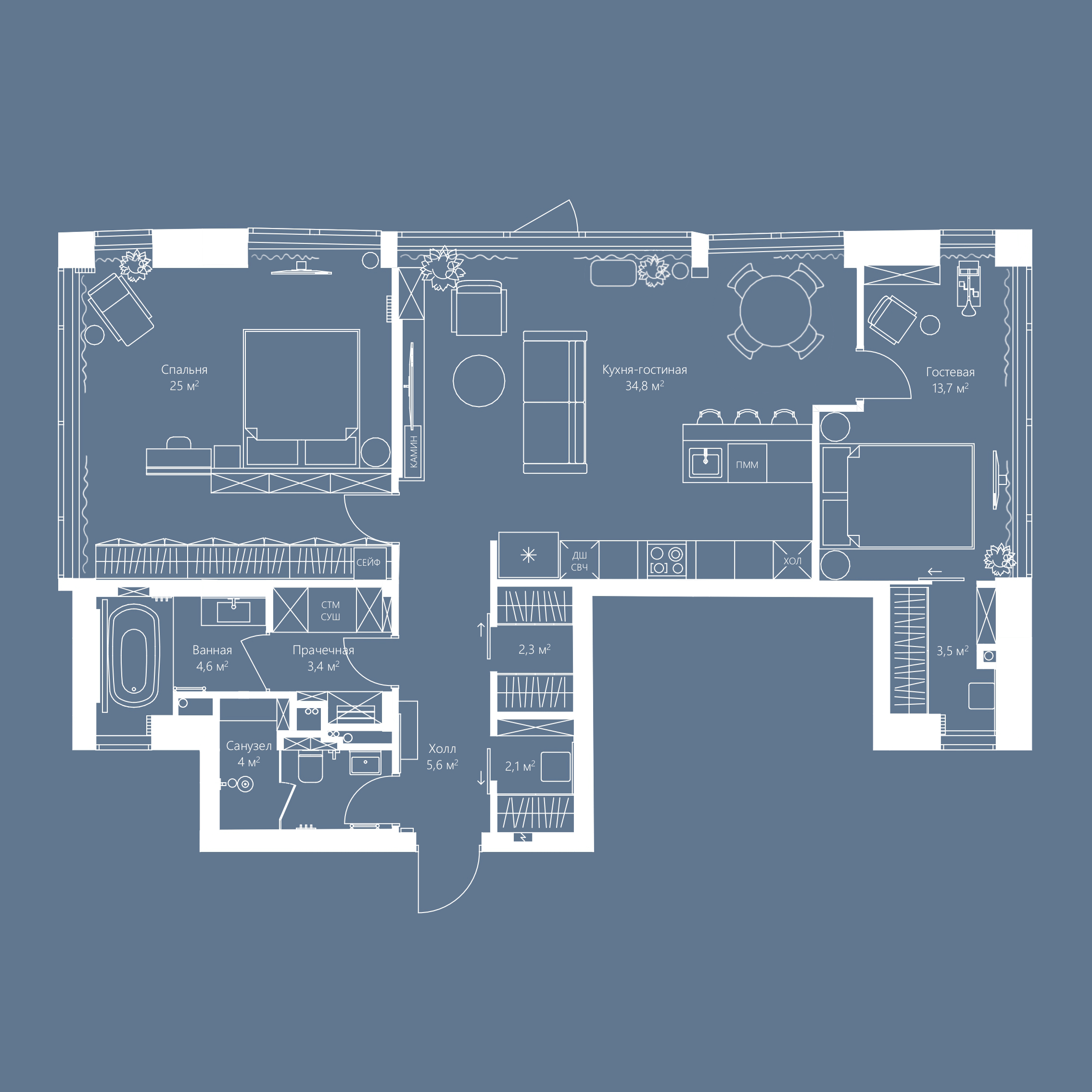 У хозяев этих апартаментов были выразительные запросы и хороший бюджет — шпон, классические карнизы и латунь в деталях, но чтобы пространство выглядело современно. Активный оникс и камень и глубокая цветовая гамма поддержали характер интерьера, а современная база — скрытые плинтусы и двери в потолок, современная мебель и освещение — сохранили баланс между декоративностью и актуальной эстетикой.