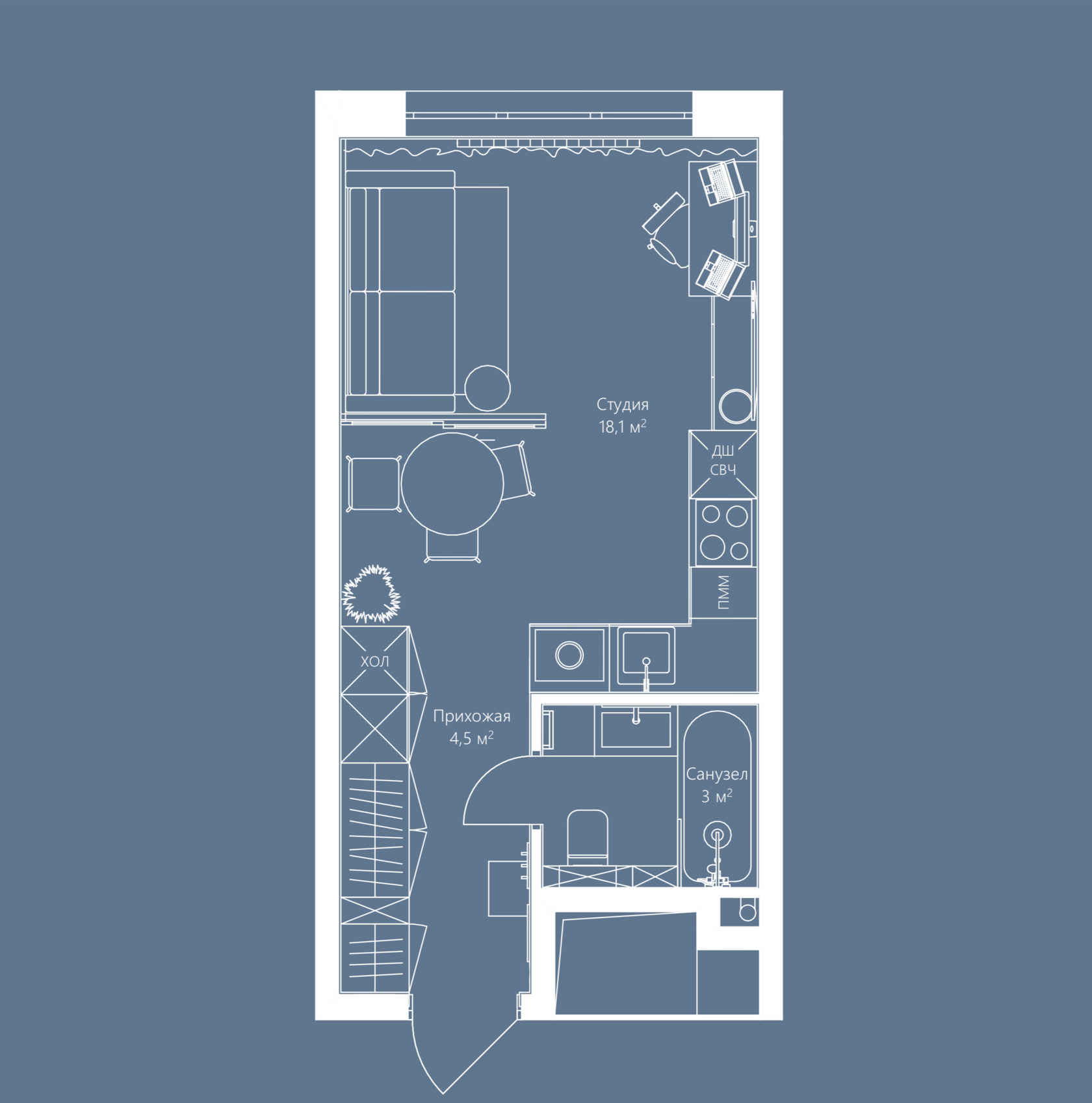 Выделили рабочую зону, полноценную кухонную зону, зону для отдыха и сна и предусмотрели место для занятий йогой. Выжали максимум из этого пространства, чтобы нашим клиентам было комфортно и красиво тут жить.